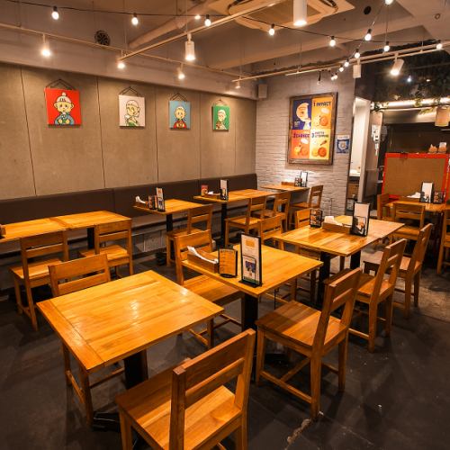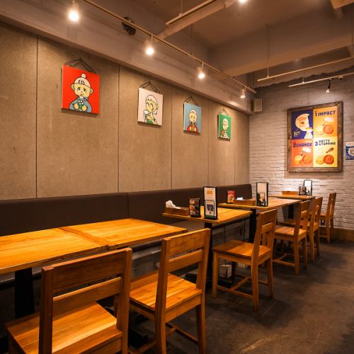 【木の温もりが心地いいテーブル席】木のぬくもりを感じるテーブル席は、落ち着いた雰囲気でほっとできる空間。ひとりでもグループでも、ゆったりとリラックスしながらお食事をお楽しみいただけます。バーガーを頬張りながら、ゆるりとした時間をどうぞ。
